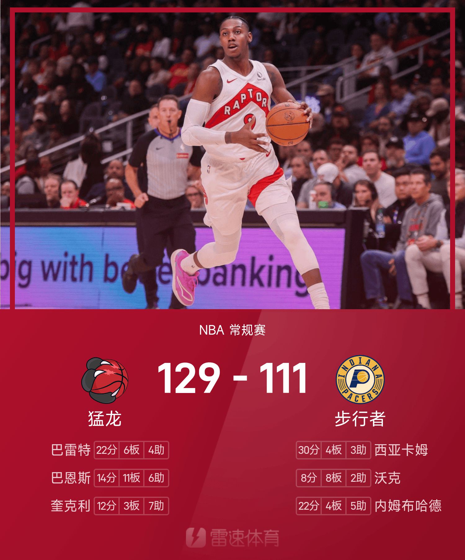 猛龙129-111步行者