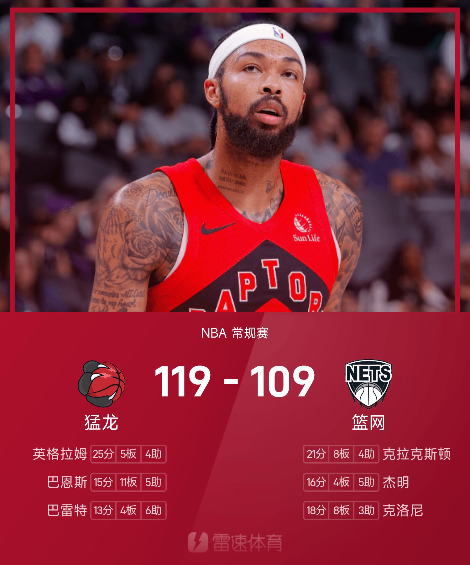 NBA战报:英格拉姆25分,猛龙119-109击败篮网