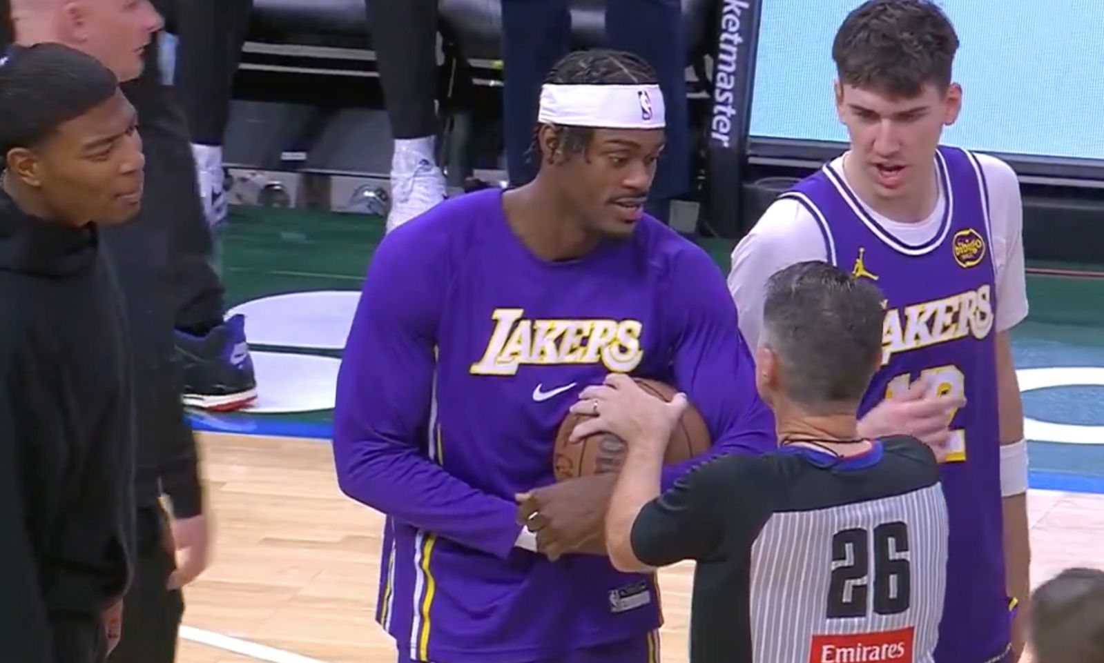 随后,裁判员将竞赛用球给了雄鹿主队场工作人员,湖人球员看到后上前解释想拿走竞赛用球,但雄鹿工作人员依然没有要给的打算,最终还是字母哥看到后,直接走上前来,主动将竞赛用球送给了东契奇,双方互相拍了拍表达友善。