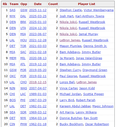 算上今天的文班亚马和卡斯尔,NBA历史上一共出现过20次同场同队球员同时砍下三双的神迹。其中三双王威少参与其中4次最多,约基奇参与3次排名第二,两人有两次同场砍下三双,也是历史唯一一对。詹姆斯参与其中两次。除了三人之外,其余没有球员能超过1次。