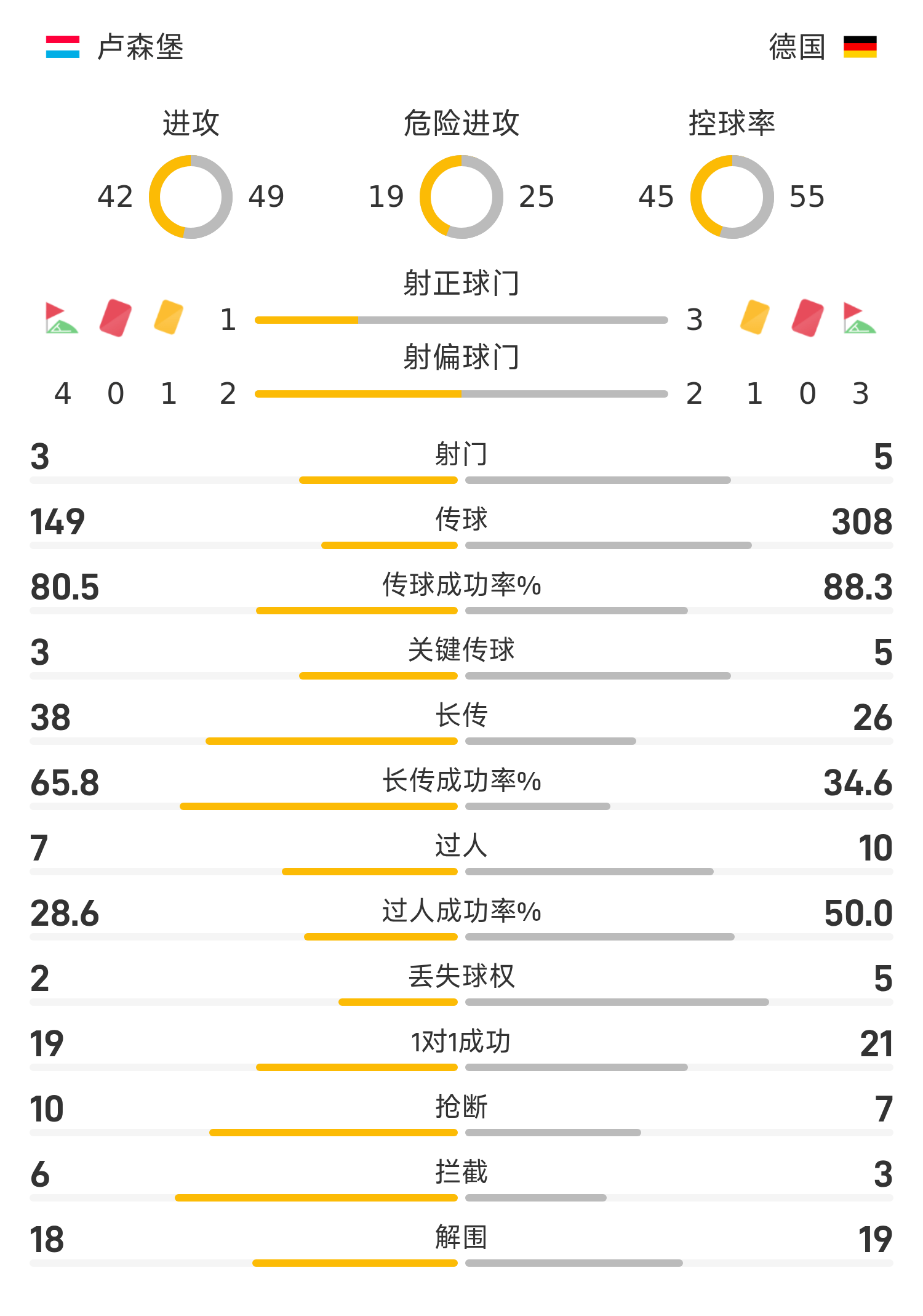 卢森堡首发阵容:1-莫里斯、18-扬斯、4-博纳特、13-卡尔森、2-科拉克、8-马丁斯、15-蒂尔、16-巴雷罗、19-奥尔森、7-达达里、10-塞纳尼