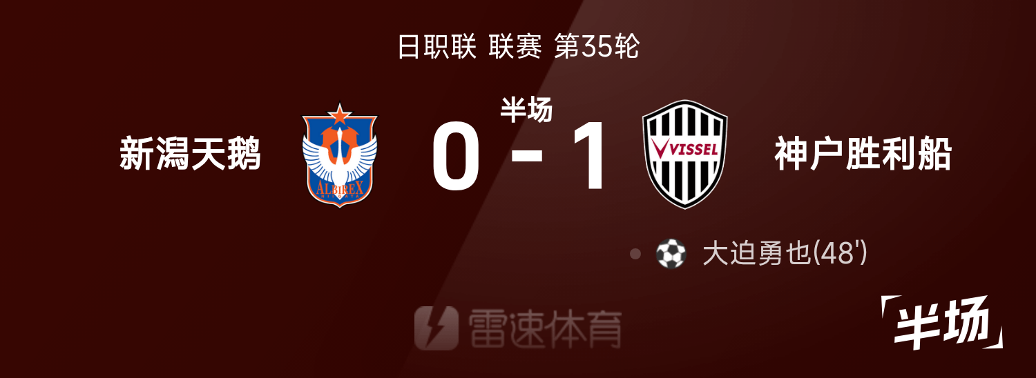 日职联半场:大迫勇也补时破门,新泻天鹅暂0-1神户胜出局船