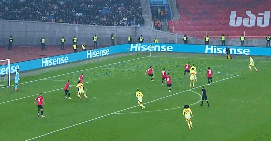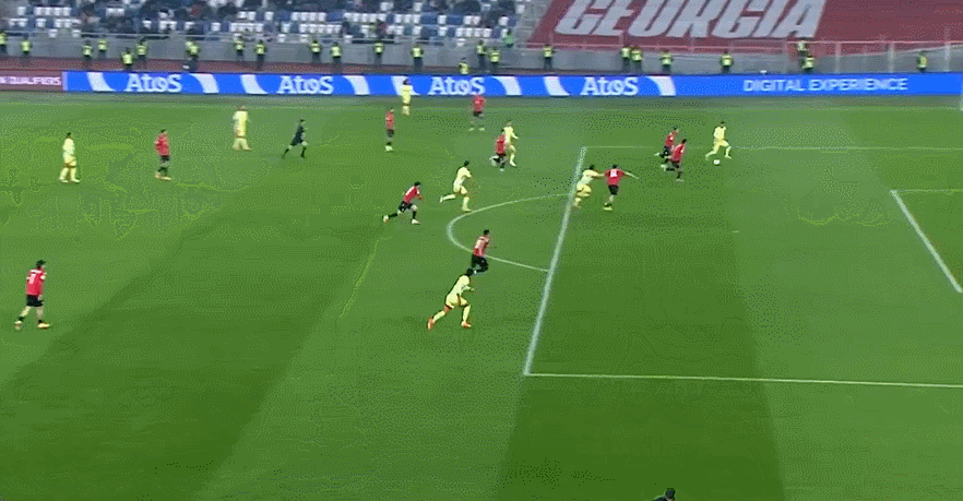 此役开局第7分钟,托雷斯突入三秒区迎球传禁区造成戈霍利什维利手球,西班牙因此获得十二码机会,奥瓦萨瓦尔随即主罚十二码破门首开记录。第34分钟,托雷斯前插到门前接应奥亚萨瓦尔横传推远角准空门命中,力助西班牙将领跑位优势扩展到3-0。