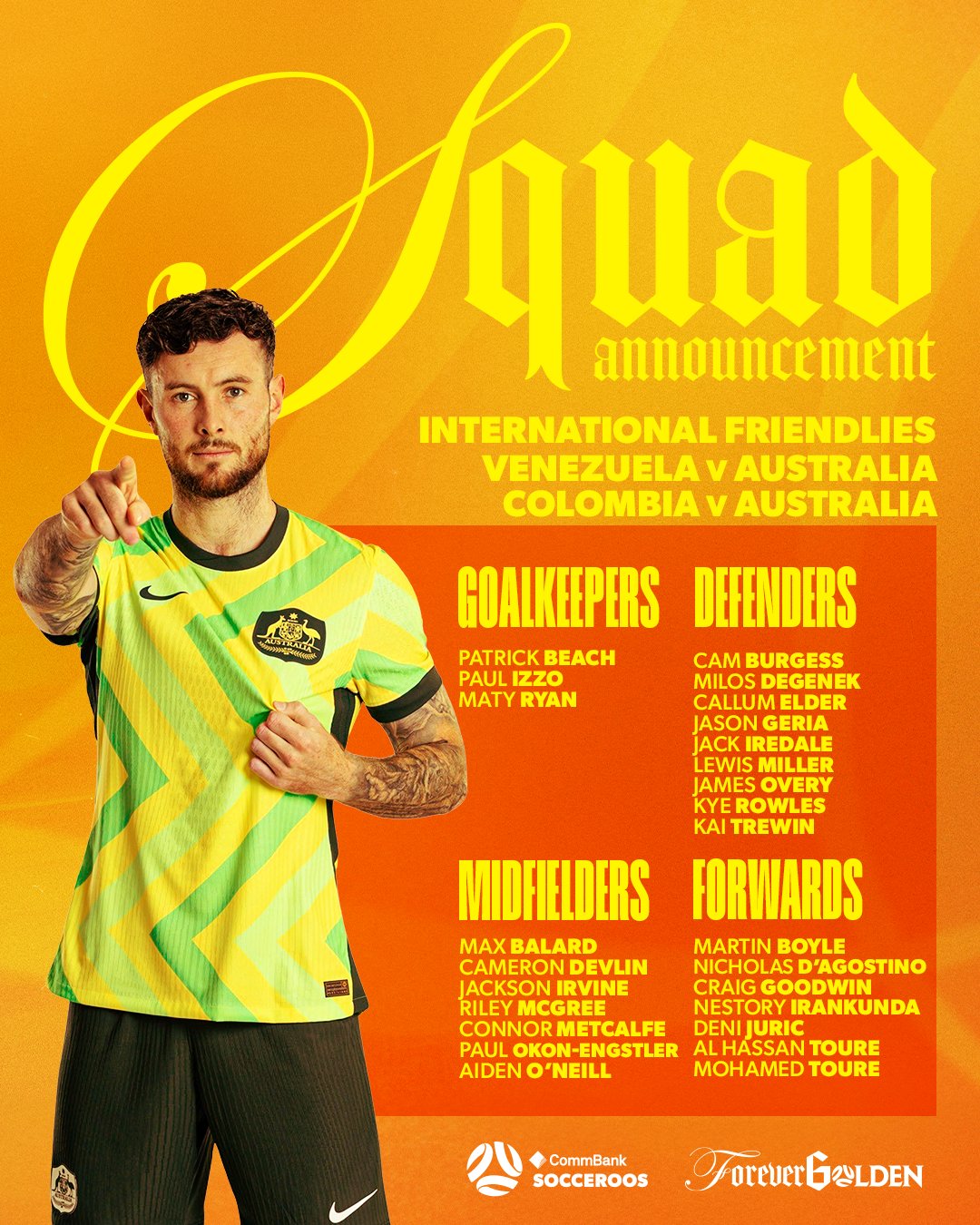 澳大利亚公布11月国家队大名单:古德温、博伊尔、欧文在列