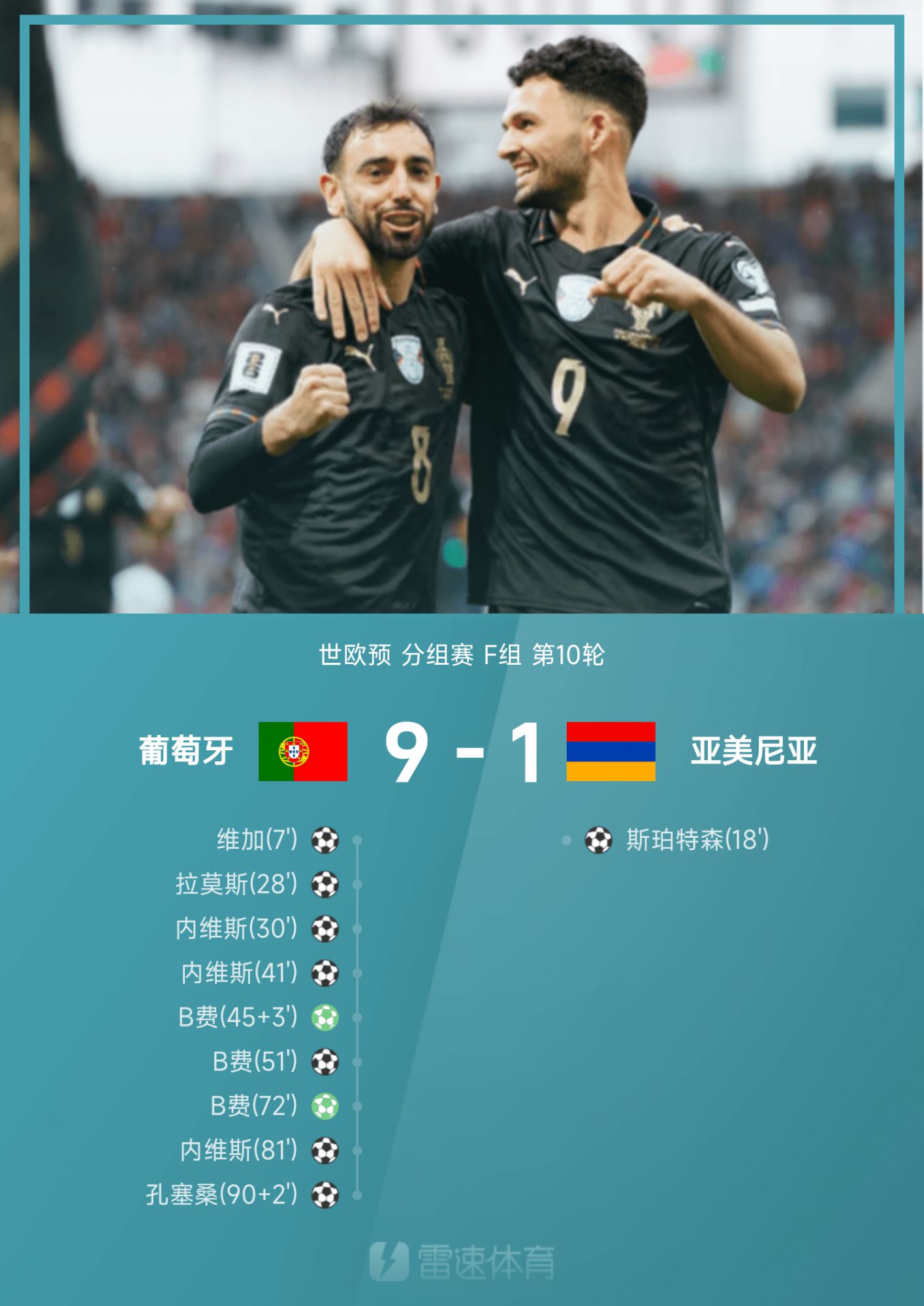 6686体育11月16日讯 26赛季世欧预分组赛F组第10轮,葡萄牙主队场以9-1狂胜亚美尼亚。维加为葡萄牙闪击,随后斯珀特森为亚美尼亚扳平局赛果分;接下来的竞赛里,葡萄牙队有如神助,内维斯和B费相继完成帽子戏法,拉莫斯送出传射,孔塞桑为球队锦上添花。葡萄牙以4胜1平1负积13分,斩获F组第一,直接获得2026美加墨世杯赛的入场券。