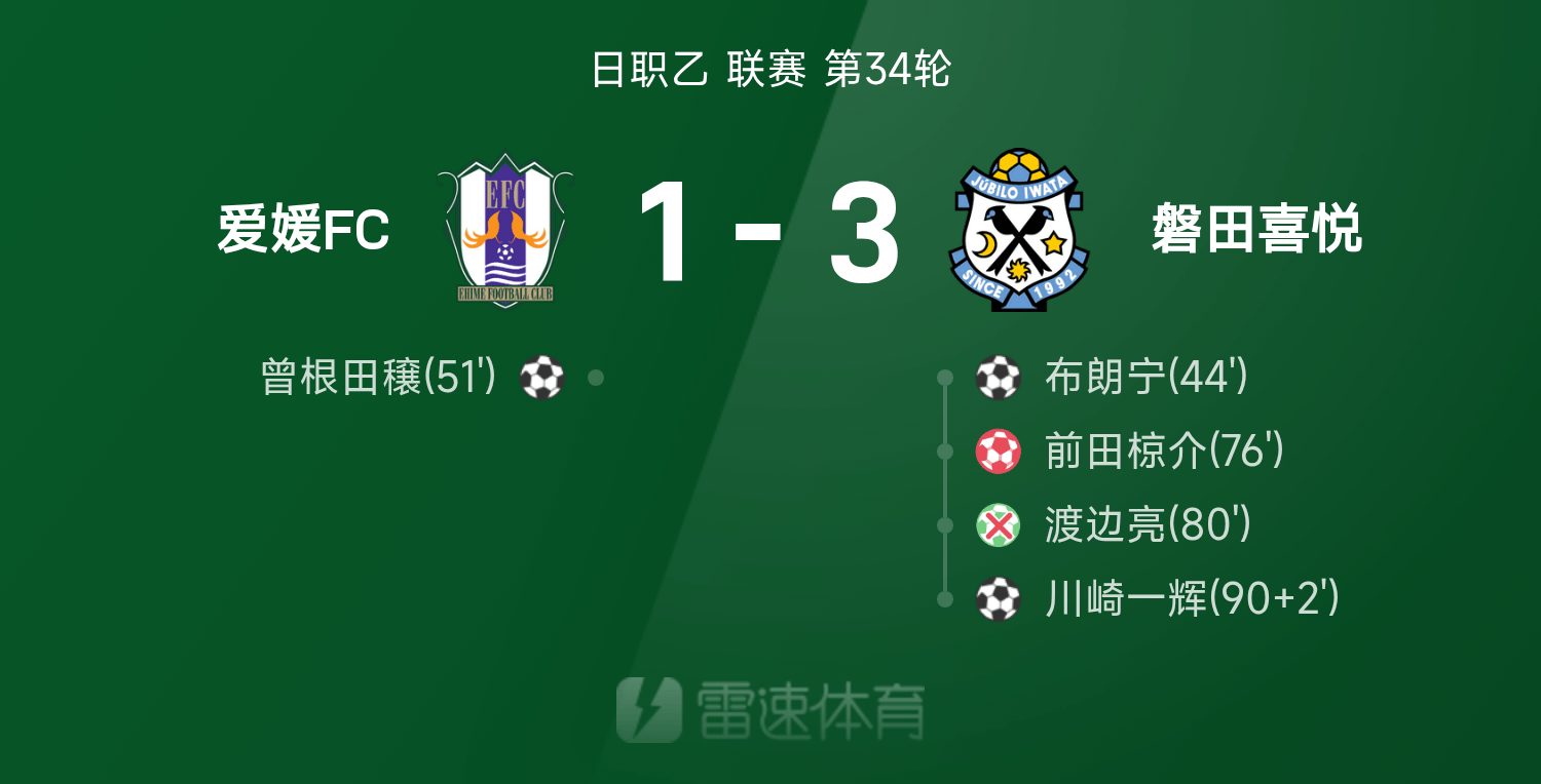 日职乙战报:前田椋介乌龙,渡边亮失点,爱媛1-3磐田喜悦