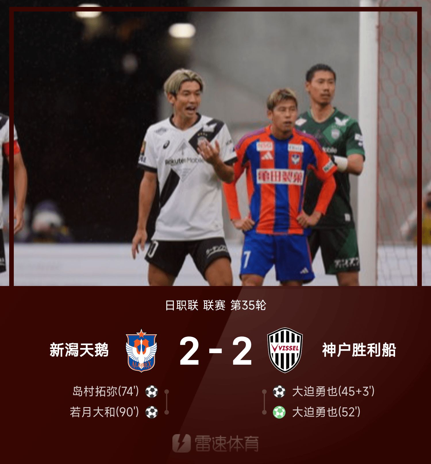 日职联战报:若月大和后备队员救主,新泻2-2逼平神户