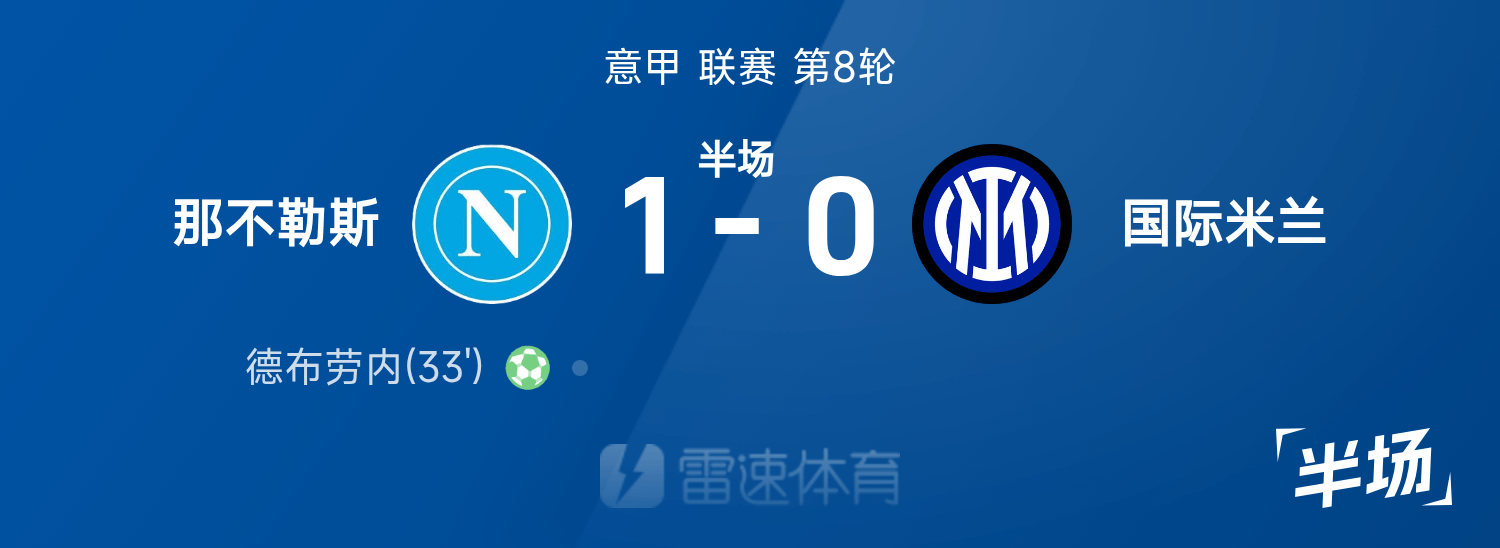 意甲半场:德布劳内点射后伤退,那不勒斯1-0国米