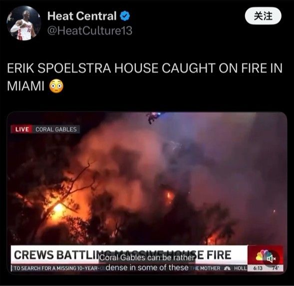 6686体育11月6日讯 今日,据美媒Heat Central报道,热火主帅斯波尔斯特拉家中突发严重火灾,NBC在报道中可以确定这就是这位名帅的家。
